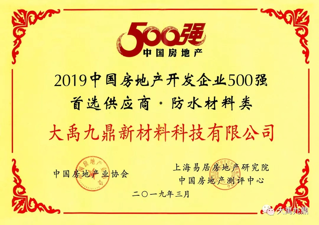 近两年来,大禹九鼎加大研发与科技创新力度,追求卓越,相继荣获国家高新技术企业、中国房地产开发企业500强首选供应商、中国十大房地产优秀供应商品牌等荣誉。目前已与碧桂园集团、金科、奥园、敏捷地产、新欧鹏、珠江投资等龙头地产公司建立了长期战略合作伙伴关系。