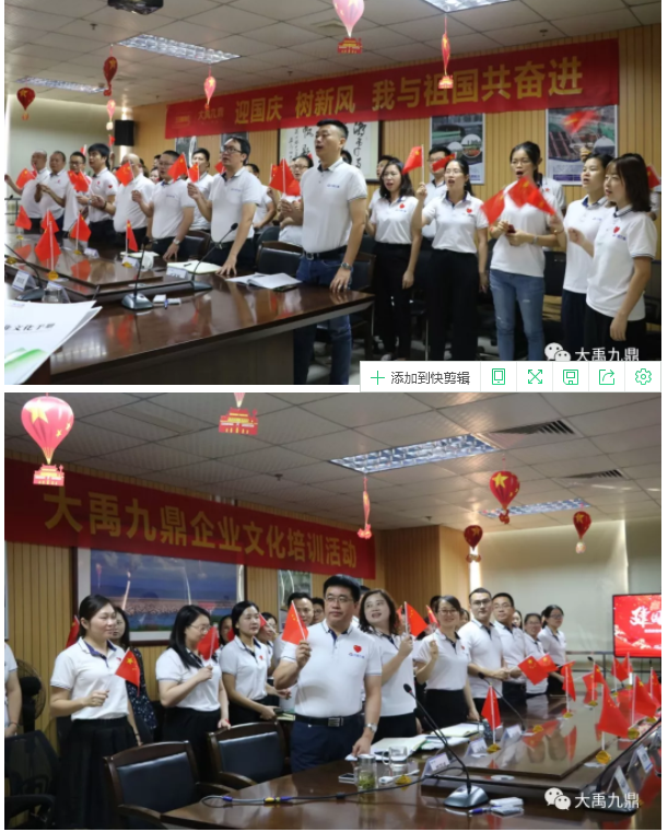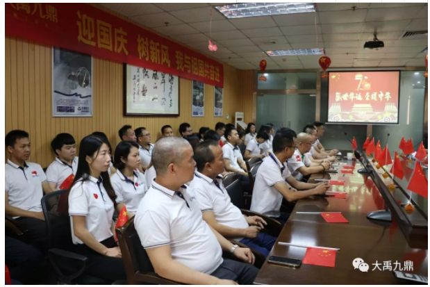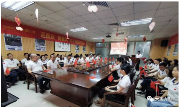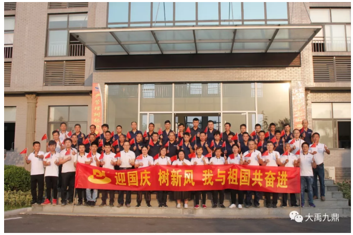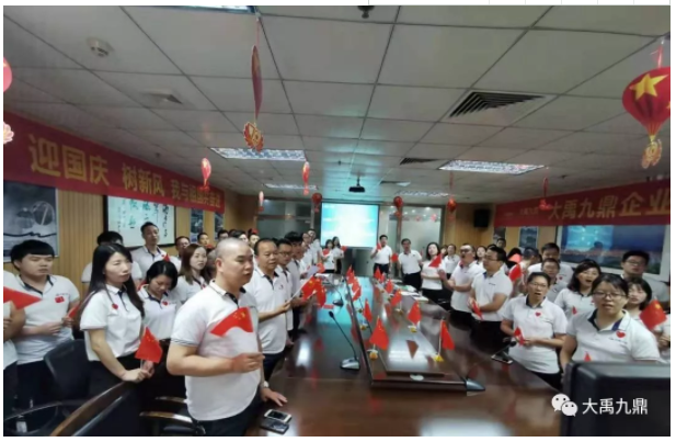 9月28日,在喜迎新中国成立70周年之际,大禹九鼎总部及广东广州、广东清远、湖北孝感三大生产基地,举办了“迎国庆 树新风 我与祖国共奋进”暨大禹九鼎企业文化培训活动,为祖国庆生,为企业树魂。