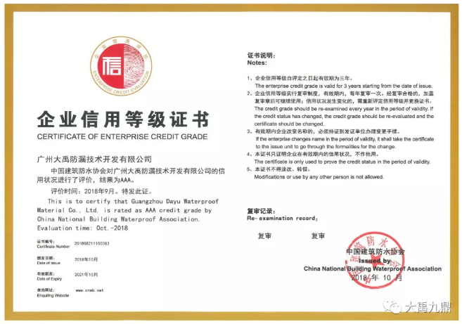 至此,大禹九鼎新材料科技有限公司及广州大禹防漏技术开发有限公司双双获得此项荣誉。