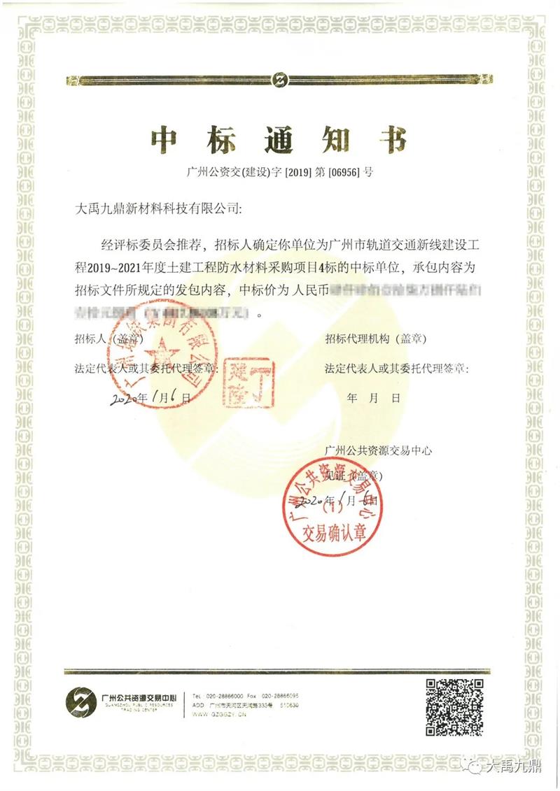 春耕早,传捷报。三棵树•大禹九鼎中标广州市轨道交通新线建设工程2019~2021年度土建工程防水材料采购项目,涉及广州地铁8号线北延段、12号线、13号线二期、14号线二期、18号线、22号线的防水材料供应及技术服务。