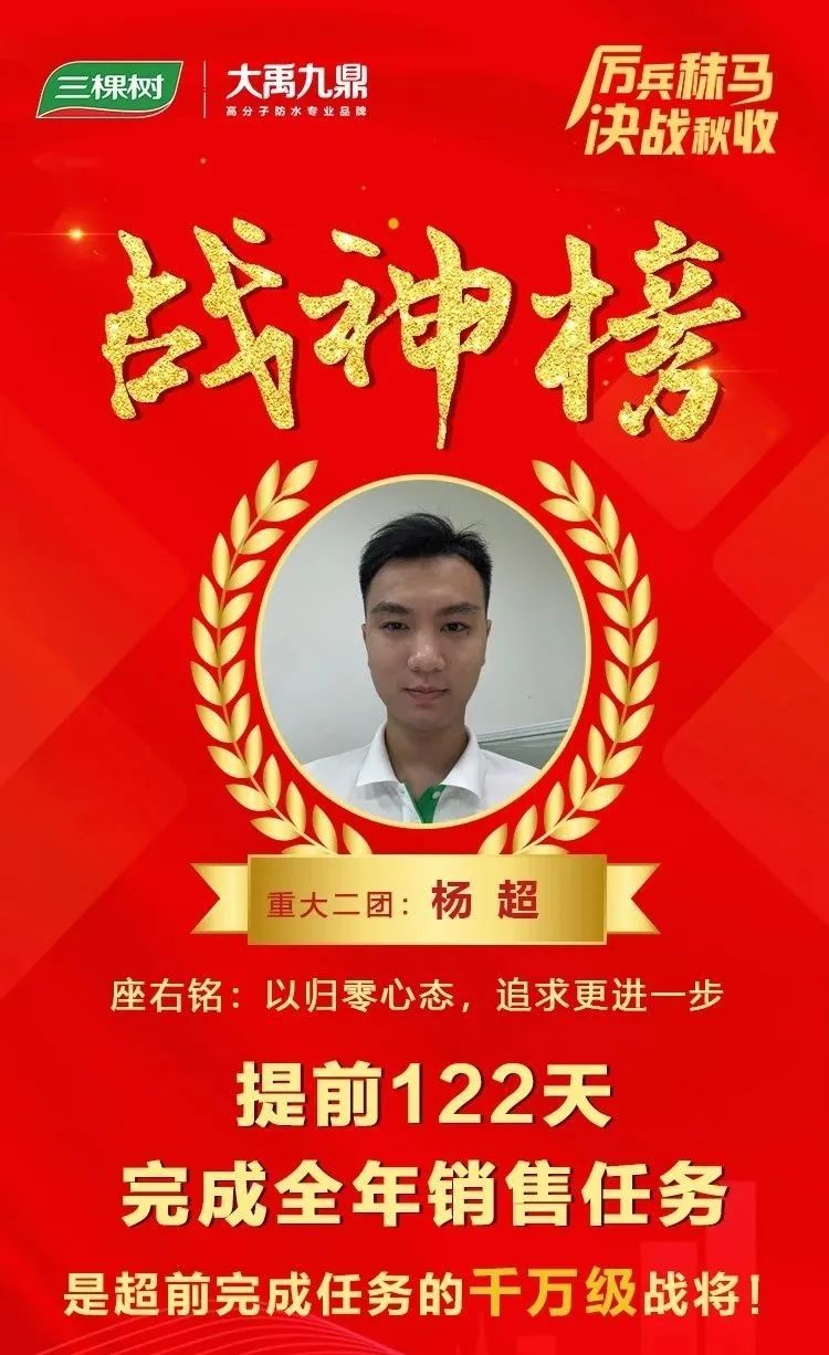 杨超,三棵树·大禹九鼎直营部销售经理。2019年2月入职大禹九鼎,入职以来以公司愿景为自身奋斗目标,保持“归零”心态,矢志奋斗,锐意进取。截至8月底,杨超已完成全年销售任务,是公司超前完成千万级任务的新锐战将!