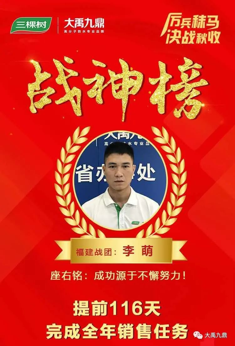 李萌,2019年7月入职三棵树·大禹九鼎,负责厦门区域防水材料销售渠道开发工作。日前,已完成全年销量的105%,提前116天完成全年销售任务。