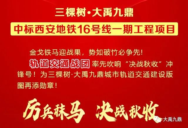金戈铁马迎战果,势如破竹必争先。9月1日,三棵树·大禹九鼎正式点燃“决战秋收”的战火,大禹九鼎人剑指长空,卯足干劲,奋力拼搏,首迎战果:西安地铁16号线一期工程项目。