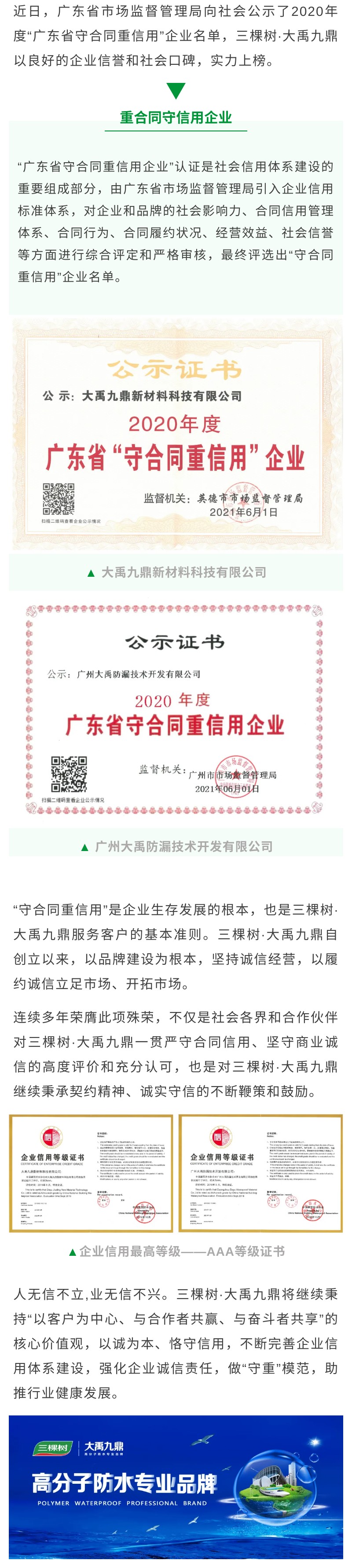 三棵树·大禹九鼎荣膺“广东省守合同重信用企业”