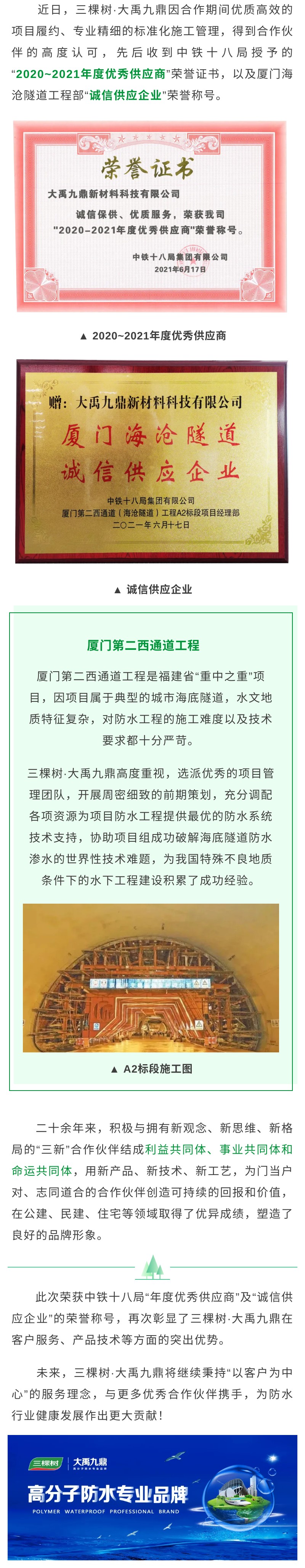 三棵树·大禹九鼎荣获中铁十八局“年度优秀供应商”荣誉称号