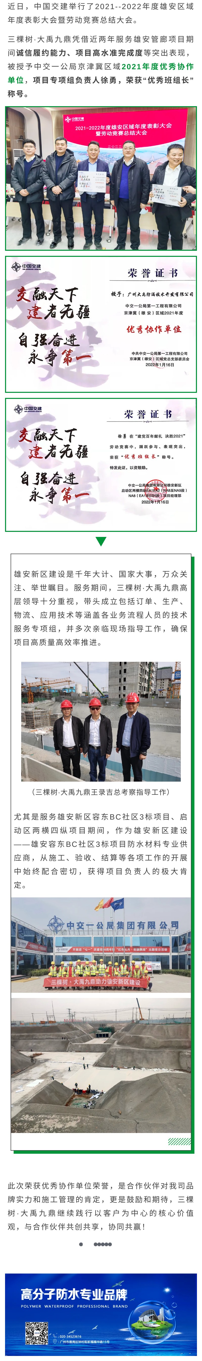 优秀协作单位!三棵树·大禹九鼎荣获中交集团优秀协作单位荣誉