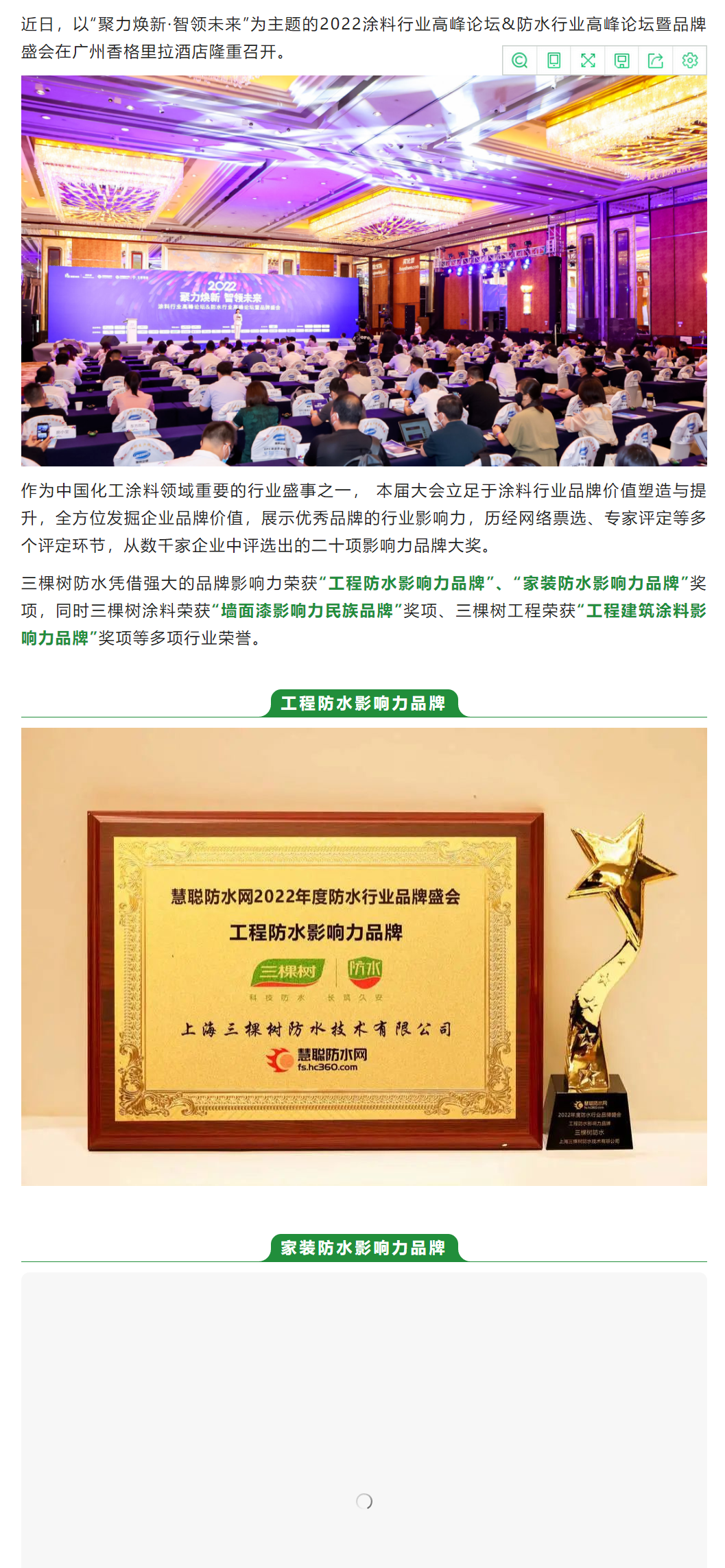 实力彰显!三棵树防水获“工程防水影响力品牌”等多项荣誉