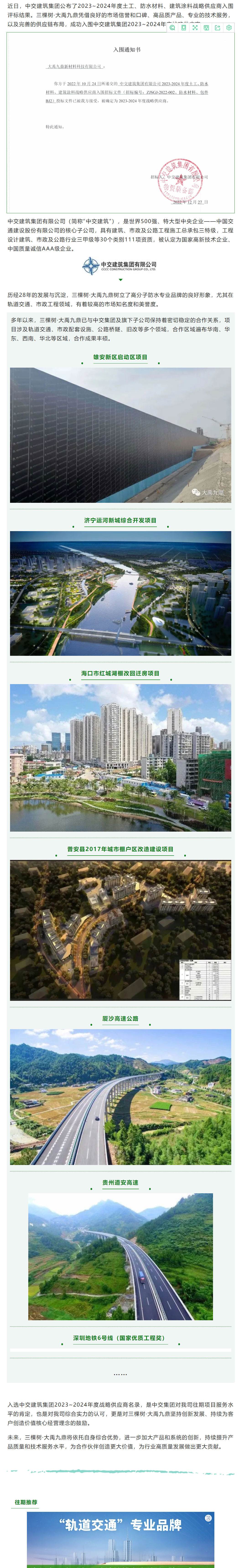 战报!三棵树·大禹九鼎入选中交建筑集团2023~2024年度战略供应商