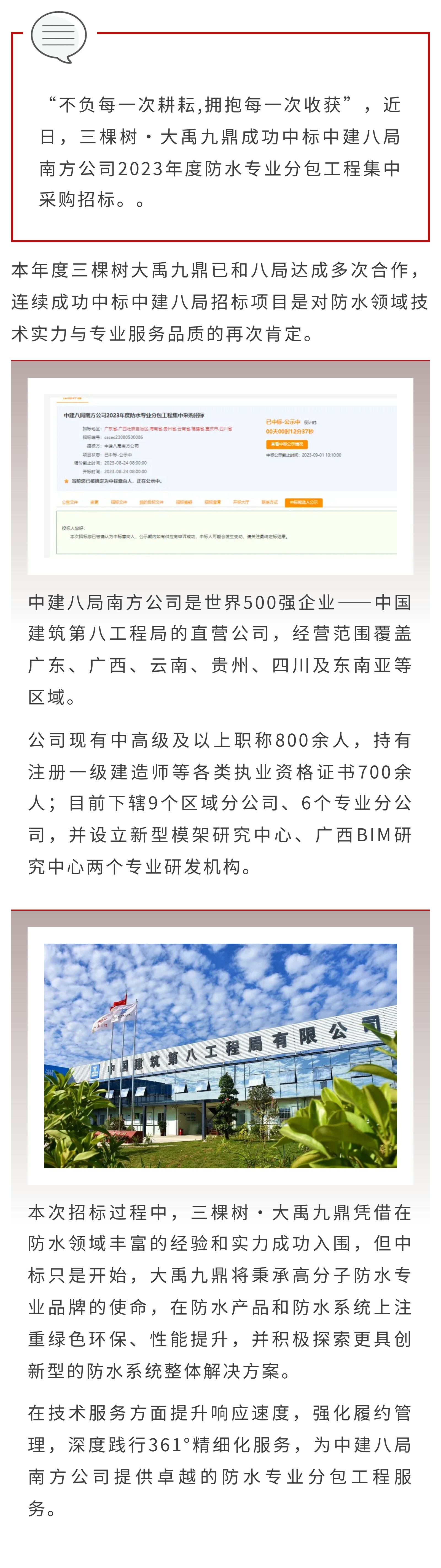 又攻下一城!三棵树·大禹九鼎中标中建八局南方公司2023年度防水专业分包工程集中采购招标