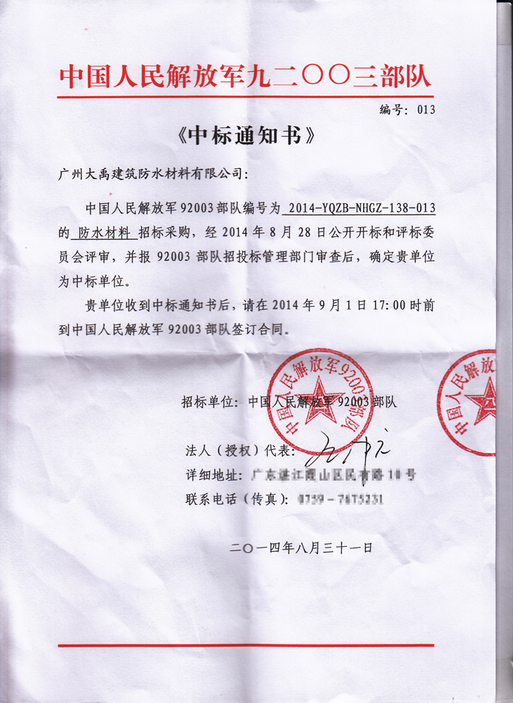 贺大禹公司中标 中国人民解放军 九二ΟΟ三部队