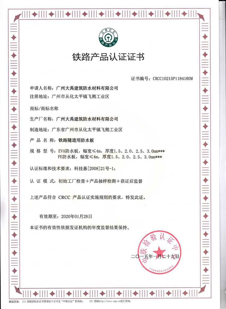 热烈祝贺广州大禹公司荣获CRCC 认证证书