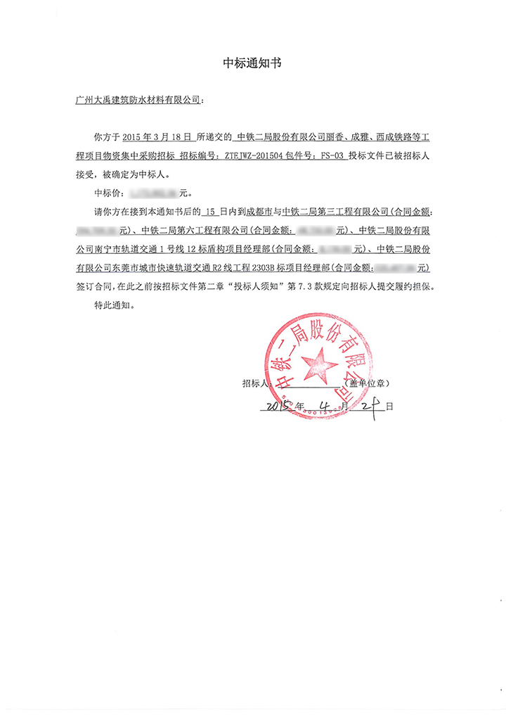 辛勤的付出得到了回报,五一前夕,广州大禹公司接到了来自中铁二局股份有限公司的中标通知书。中标中铁二局股份有限公司工程项目,在本次中铁二局股份有限公司工程项目物资集中,广州大禹公司成功的拿下了丽香、成雅、西城铁路等工程防水项目。这是我司今年以来在铁路工程项目中又一单。