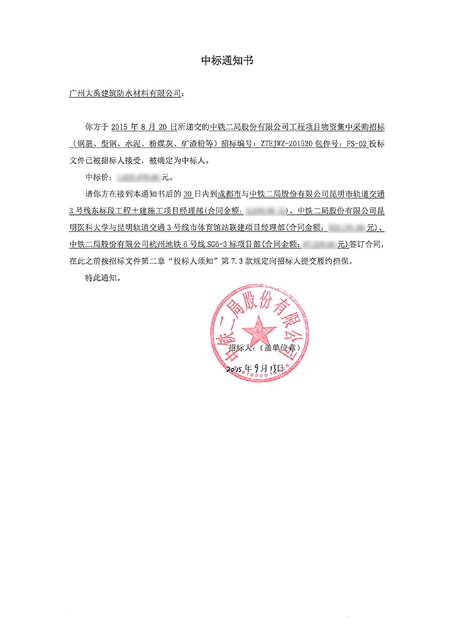 昨日,广州大禹再传喜报,继成功中标深圳地铁9号线,深圳地铁11号线之后,又接到三个地铁项目中标通知书。分别为杭州地铁6号线SG6-3标段、昆明轨道交通3号线市体育馆站联建项目、以及昆明市轨道交通3号线东标段等防水工程项目,值得庆贺!