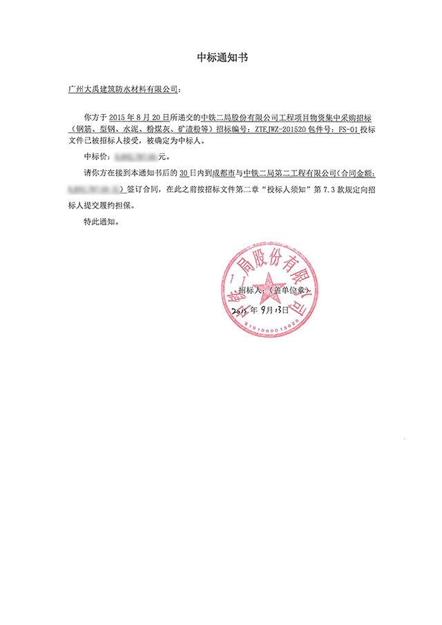 继广州大禹公司在2015年3月份中标的丽香、成雅、西成铁路等工程项目物质采购FS-03项目、2015年7月份中标的深圳地铁11号线BT项目自购物资防水材料FS-02包件后,最近,广州大禹公司再一次中标了中铁二局股份有限公司工程项目物资集中采购招标(招标编号:ZTEJWZ-201520)FS-01项目,防水材料供应共889万。
