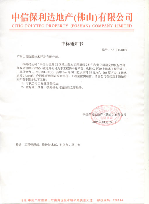 中信保利达地产(佛山)有限公司中标通知书