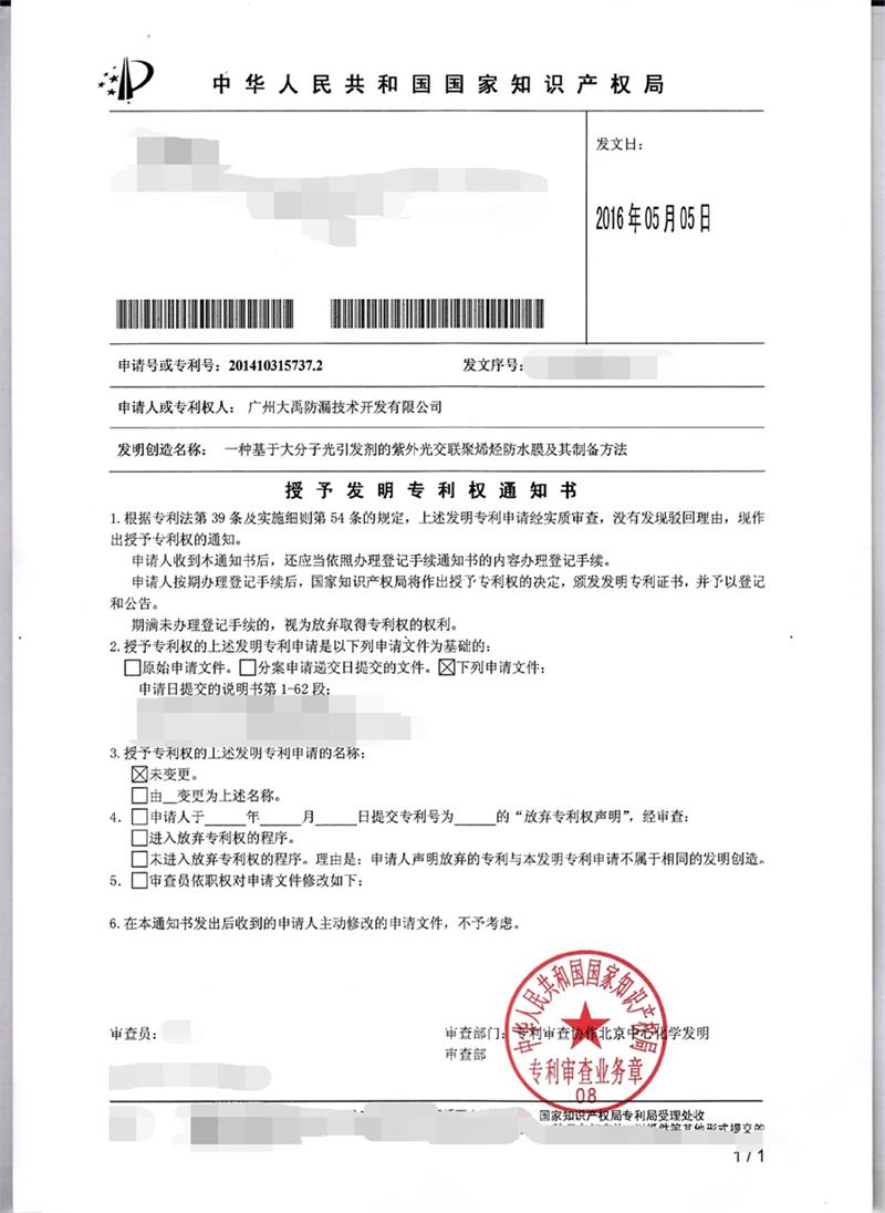 继上月我司陆续取得5项国家实用新型专利证书,近日,从国家知识产权局再次传来喜讯,我司又一项发明专利获得国家知识产权局的授权,在履行缴纳专利登记费及年费等事宜后,将取得相关的专利证书。此次授权的专利是:一种基于大分子光引发剂的紫外光交联聚烯烃防水膜及其制备方法,专利类型:发明专利。