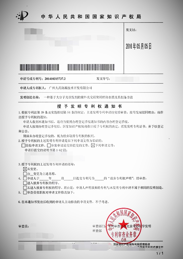 多年来,广州大禹一直致力于绿色环保新产品的研发与推动,早于2004年公司就成立了研发中心,主要承担绿色防水材料与应用技术研究开发及成果转化等科研工作。近年来,研发中心加大攻关力度,开展了一系列的研究研发,并取得了丰硕成果,在其主导下,我司近2年取得了5项发明专利,11项实用新型专利。