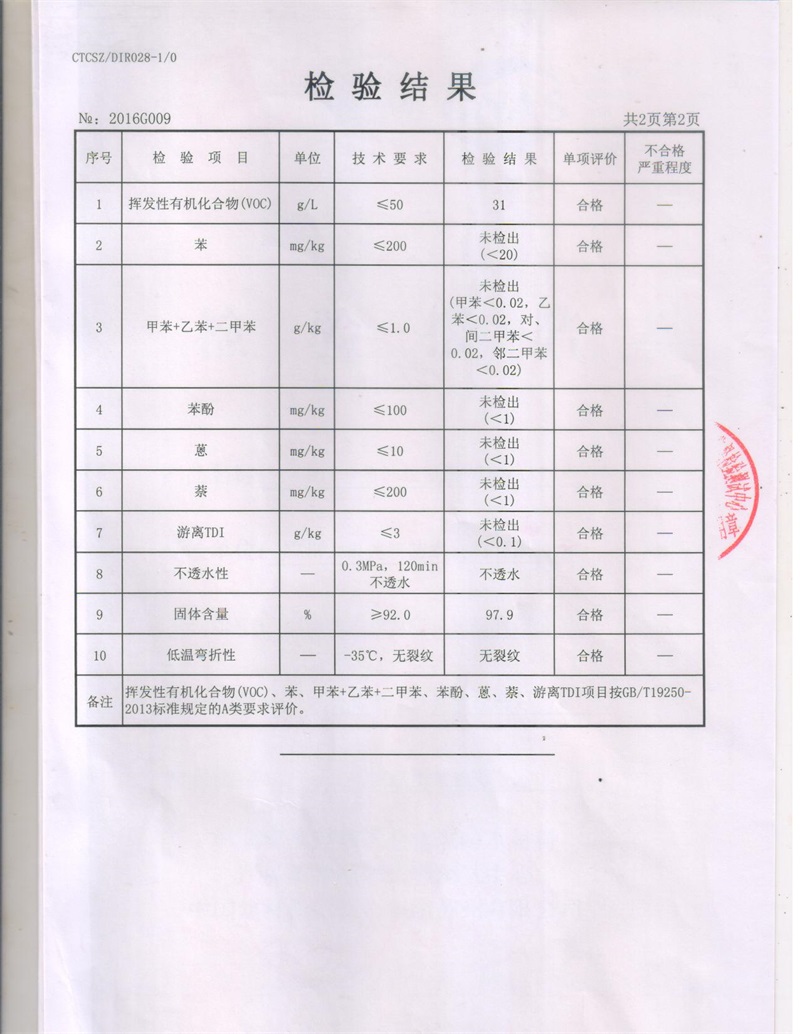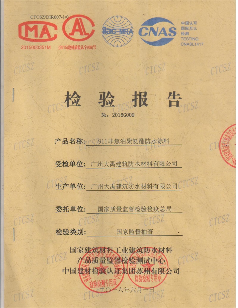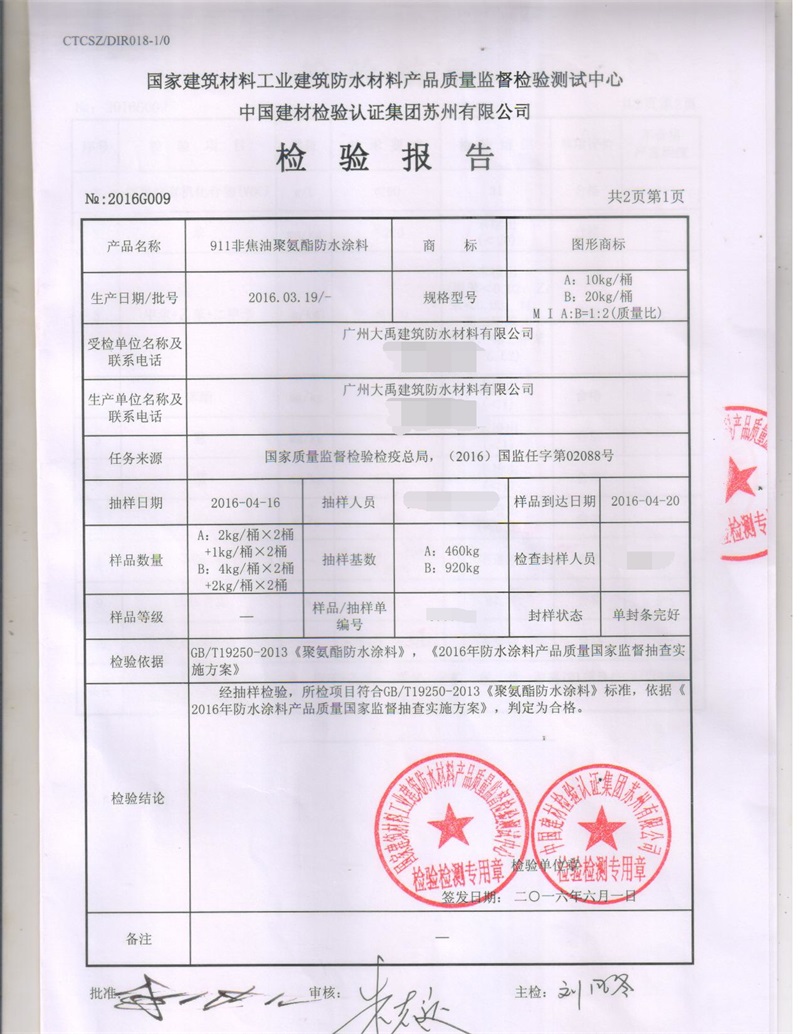 4月16日,质检总局对我司生产的911非焦油聚氨酯防水涂料进行了产品质量监督抽查,6月8日检测结果已出,我司被抽查产品各项指标检测均合格,其中挥发性有机化合物(VOC)、苯、甲苯+乙苯+二甲苯、苯酚、蒽、萘、游离TDI项目按GB/T19250-2013标准规定的A类要求评价。