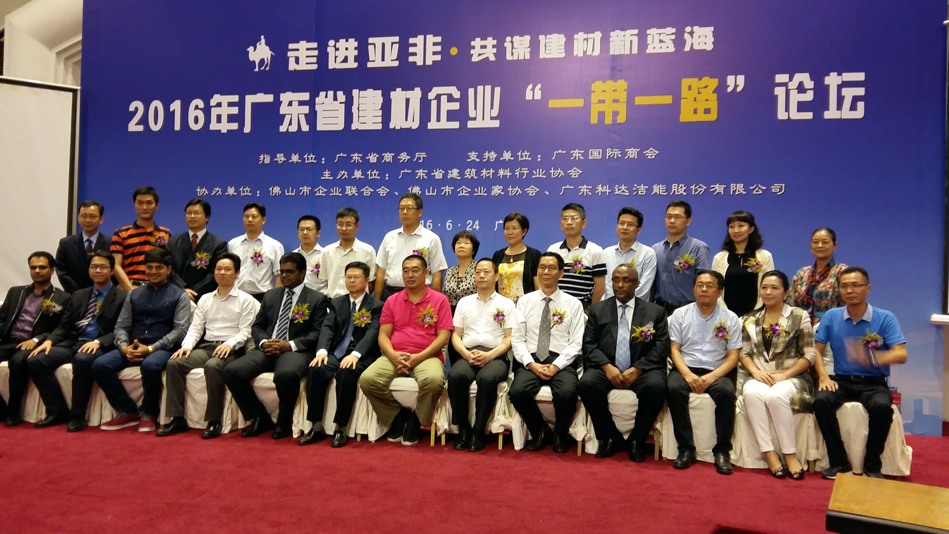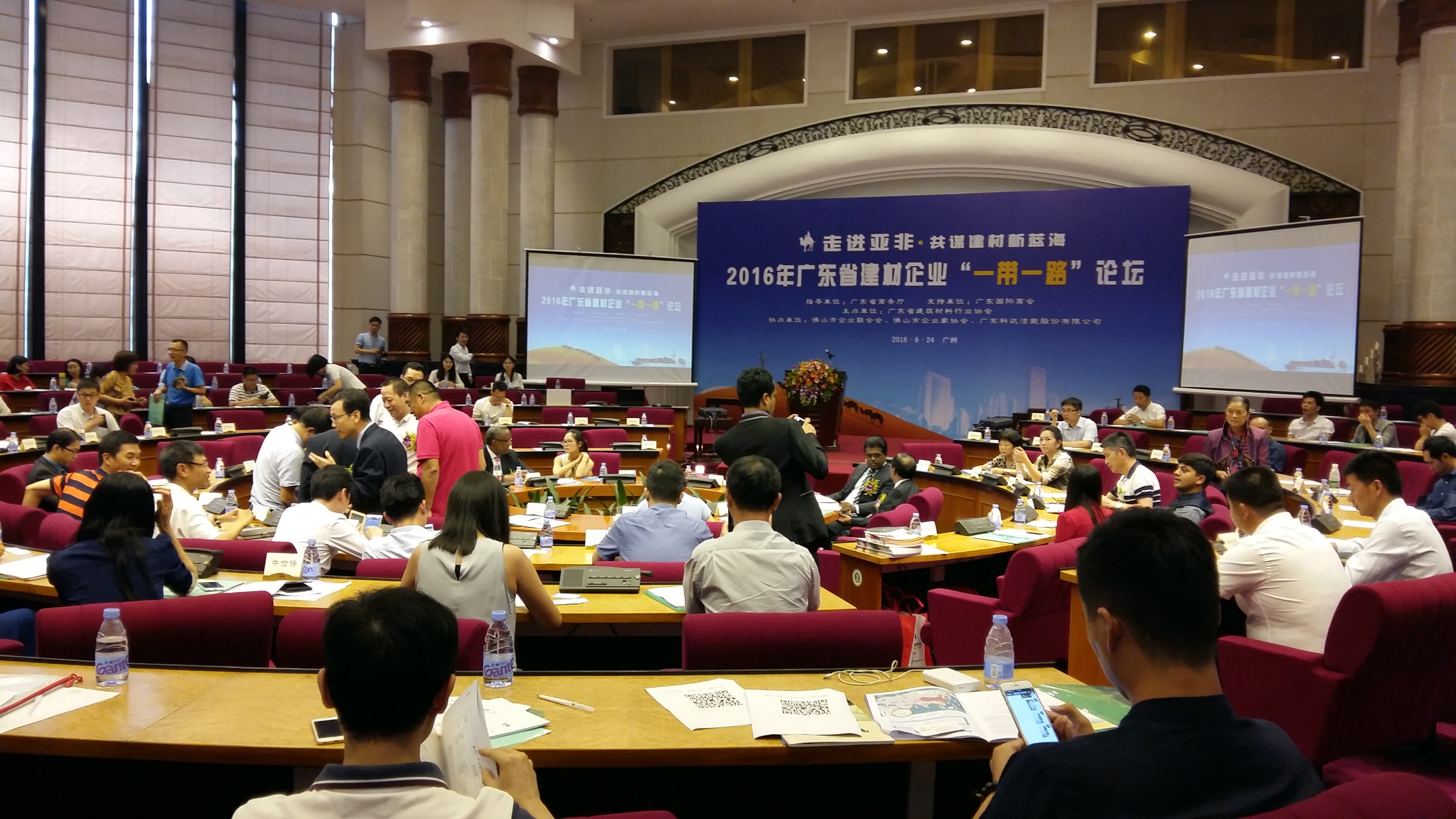 6月24日,“走进亚非•共谋建材新蓝海——2016年广东省建材企业’一带一路’论坛”在广州隆重举行。这次交流活动由广东省建筑材料行业协会主办,佛山市企业联合会、佛山市企业家协会等单位协办。广东省商务厅、埃塞俄比亚总领事馆、印度安得拉邦政府等政府机构代表,广东国际商会、省水泥协会、省玻璃协会、广东陶瓷协会、省预拌混凝土协会、省建筑防水材料协会、佛山市建材协会、深圳市建材协会等行业协会,来自全省建材行业及相关配套产业的领军企业代表和受邀的政府有关部门领导及主流媒体近200人出席此次论坛。我司总经理胡筱诚也受邀出席了本次论坛。在会上他认真听取了相关发言人对当前亚非经济形势的分析及有关领导人对“走出去”相关政策的解读,并积极与其它已海外布局的建材企业家交流经验,认真收集海外投资与业务发展相关的重要信息,为我司制定海外市场战略布局提供决策依据。