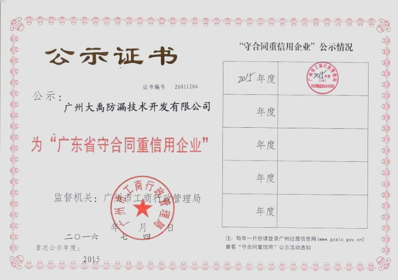 【荣誉通报】广州大禹公司荣获 “广东省守合同重信用企业”称号