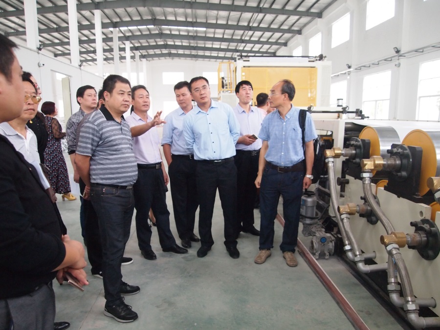 考察中,程总首先就清远基地建设规模,厂区规划,产能等整体情况向考察团做了简明介绍,随后带领大家详细参观基地生产车间,了解大禹九鼎的卷材生产设备、工艺水平。考察团首先来到的是高分子生产车间,程总着重向来宾们介绍我司最新引进的TPO卷材生产线,就该设备优势,产能、工艺等做了详细的对比介绍。考察团听取介绍后也都饶有兴致的抚触产品,切身体验产品的优异特性。