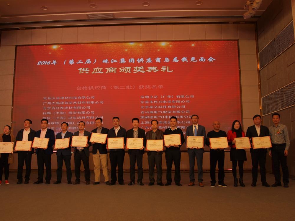 近日,我司受邀参加了2016年(第二届)珠江集团供应商与总裁见面会暨优秀供应商颁奖典礼,本次大会以“诚信服务,携手未来”为主题在广州珠江国际酒店拉开序幕,来自全国的近60家珠江地产的优质供应商共同参加了大会,共同探讨新时代下房地产行业发展方向、供应商管理的新思路以及如何实现合作共赢。会上,广东大禹再获珠江集团授予“2016年度合格战略合作伙伴”称号。截止目前,我司已连续2年成为珠江投资与合生创展“合格战略合作伙伴”。
