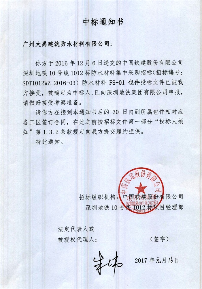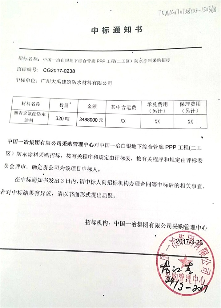 广东大禹历来以高速公路、轨道交通、桥梁、隧道、机场、地下空间、地下管廊等重大市政工程防水业务见长。公司凭借院企合作及自主研发创新,不断研制开发新产品、改良产品配方,打造DCPS高分子自粘防水卷材、TPO、PVC防水卷材、EVA防水板等高分子防水卷材核心竞争力。如今,我们的高分子类拳头产品以优异的性能指标、质量稳定,获得越来越多市政工程建设方的青睐与认可。2017年第一季度已近尾声,广东大禹市政工程业务呈稳步增长态势,项目中标捷报频传,产品订单充足。