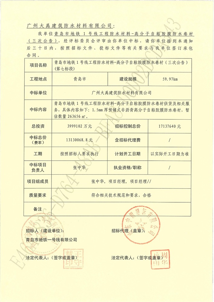 青岛市地铁1号线工程防水材料—高分子自粘胶膜防水卷材(第七标段)