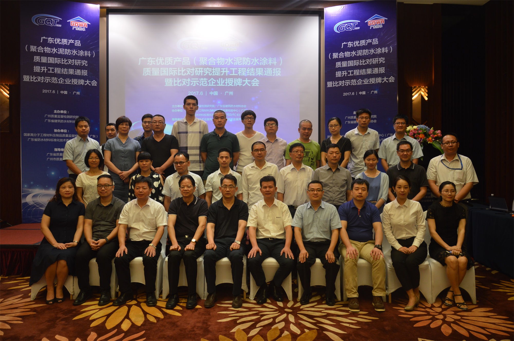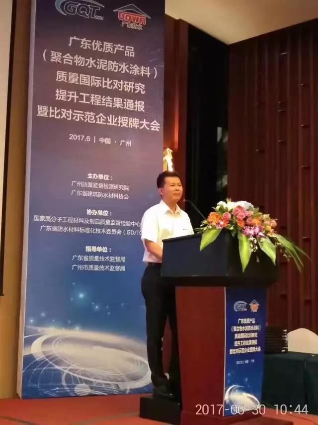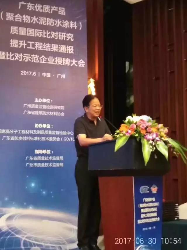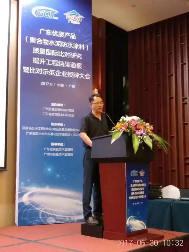 为进一步推动广东省产品质量比对工作向纵深发展,以微观产品质量提升带动产业提升从而促进广东产品质量整体提升,6月30日,广州质量监督检测研究院、广东省建筑防水材料协会联合广东省防水材料标准化技术委员会(GD/TC83)及国家高分子工程材料及制品质量监督检验中心(广东)共同举办广东优质产品(聚合物水泥防水涂料)质量国际比对研究提升工程结果通报暨比对示范企业授牌大会。广州质量监督检测研究院副院长刘春生、中国建筑防水协会副会长、深圳防水协会会长瞿培华、广东省建筑防水材料协会会长张泳东等领导出席了大会。