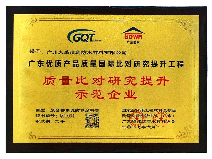 热烈祝贺广东大禹被授予首批广东优质产品(聚合物水泥防水涂料)质量国际比对研究提升工程示范企业