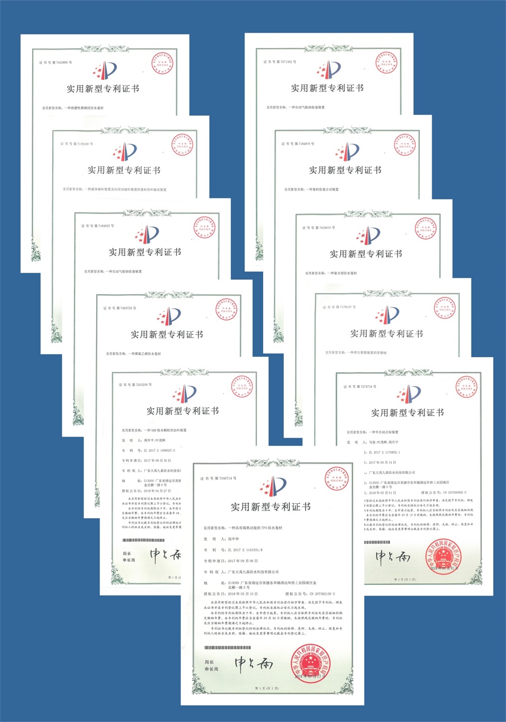 6月绽放,硕果累累。近期,大禹九鼎公司喜讯连连,由我司申报的12项专利相继获得国家专利授权,其中11项实用新型专利、1项发明专利,发明专利为“一种高抗撕裂强度EVA防水片材及其制备方法” ,专利号:201610664129.1。至此大禹九鼎公司共获6项发明专利,20项实用新型专利,同时还有20多项专利已被国家专利局受理。
