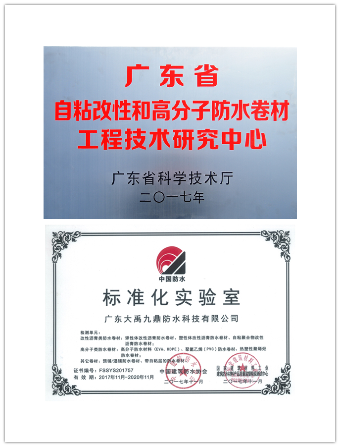 大禹九鼎坚持“绿色崛起 转型升级”战略,走自主创新之路。公司高度重视科技创新工作,科研经费逐年递增,同时有计划地引进高科技人才。目前,研发中心由一支教授级高工领衔的研发团队组成,其中不乏北大、中大等国内知名高校研究生以上学历、十几年从业经历的资深人士,构成我司研发中坚力量,推动企业产品创新、技术创新,打造企业核心竞争力,向绿色环保科技型企业转型升级。目前,大禹九鼎设有中国建筑防水标准化实验室,公司研发中心不仅是广州市级企业研发机构,更是广东省科技厅唯一授予的自粘改性和高分子防水卷材工程技术研究中心。