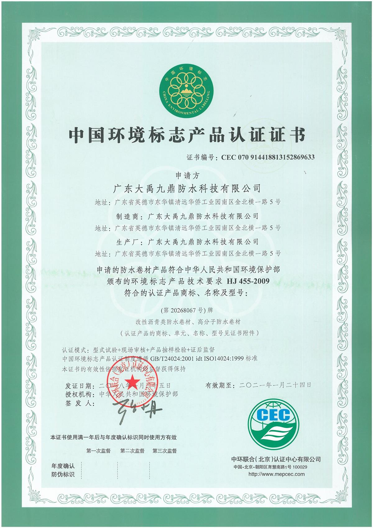 此次,大禹九鼎自粘改性和高分子全系列防水卷材入选环境标志产品政府采购清单同样具有重要意义,进一步提升了公司在绿色环保高分子领域的影响力,巩固了我司在自粘改性和高分子防水卷材领域的行业领先优势。同时,也更加坚定了我司走“绿色崛起 转型升级”发展之路的信念及信心。