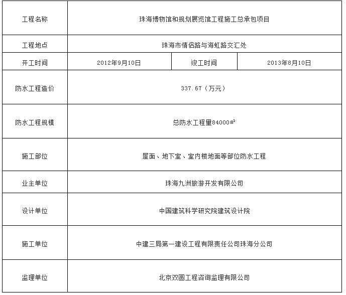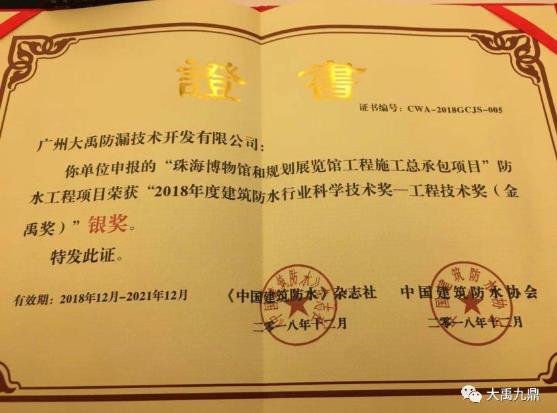 据悉,本次共有近60个项目申报,经过答辩陈述,专家组评审、项目考察等环节层层比选,最终广州大禹防漏技术开发有限公司申报的“珠海博物馆和规划展览馆工程施工总承包项目”在选材、施工工艺技术创新、工程质量管理等方面获得了专家组认可,荣获(金禹奖)银奖。