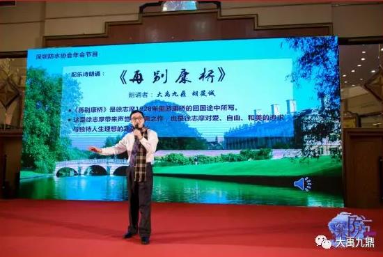 联欢活动环节,深圳市防水行业协会携6家会员企业贡献了十个节目为本次年会助兴添彩,大禹九鼎作为副秘书长单位,总经理胡筱诚亲登舞台深情表演配乐诗朗诵《再别康桥》,现场气氛一度陷入沉醉,获得好评和喝彩不断。