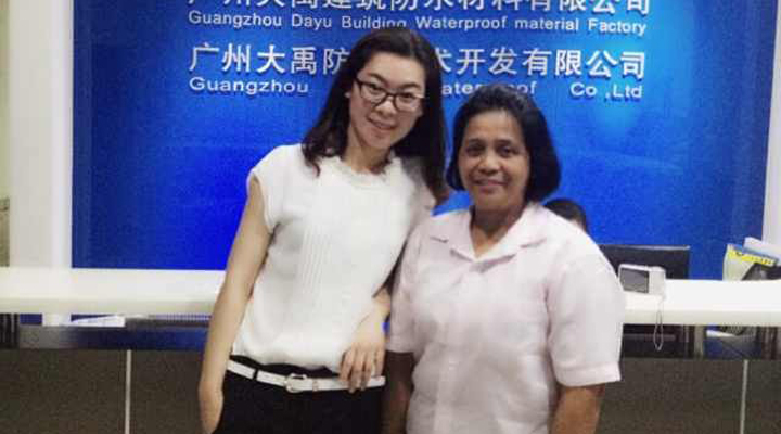 2014年5月13日,菲律宾客户Ms Adel Raza来到广州大禹公司办公室进行参观考察,主要对我司的APP防水卷材、基层处理剂、单组份聚氨酯进行了详细的咨询,通过技术交流沟通,客户对我们产品质量和价格非常满意,奠基了长期合作关系。