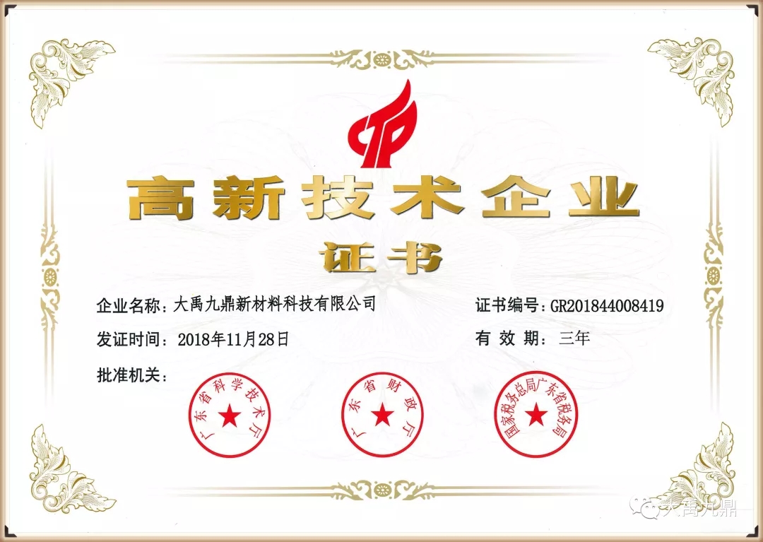 大禹九鼎新材料科技有限公司荣获高新技术企业认证证书