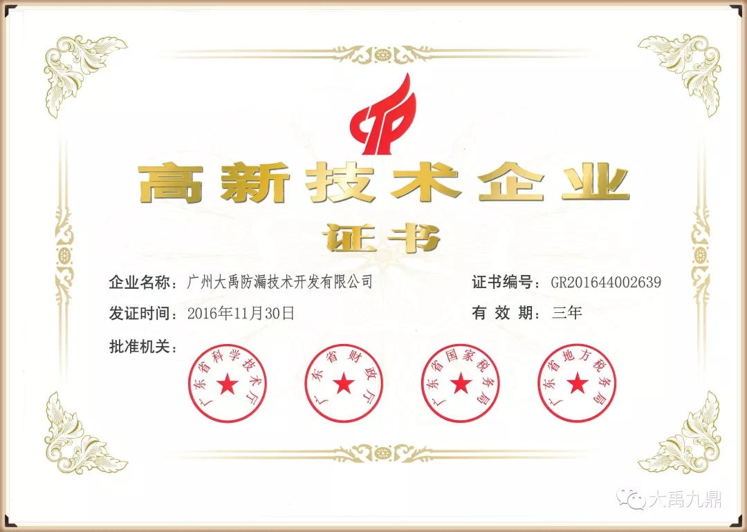 广州大禹防漏技术开发有限公司荣获高新技术企业认证证书
